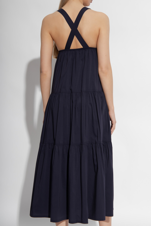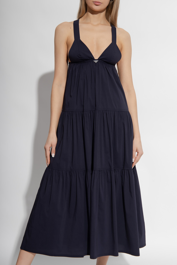 Navy beach dress from Emporio Armani. This flared design features a metal logo detail in silver-tone, V-neck and shoulder straps criss-crossed at the back.