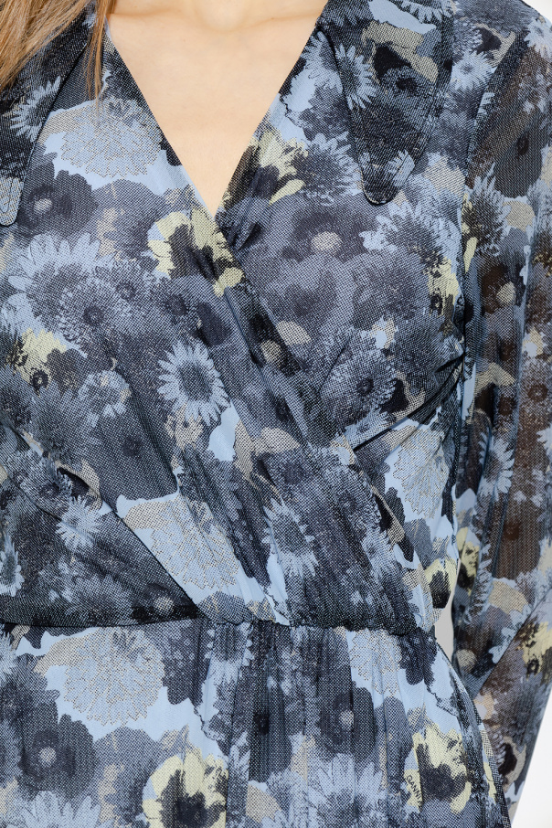Blue, black and green dress from Ganni. Made of recycled fabric, this long sleeve design is decorated with a floral pattern.