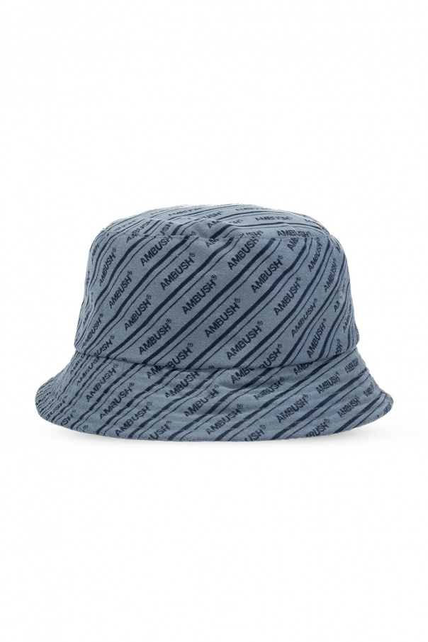 Blue hat from Ambush. This item showcases a logo pattern in navy blue.