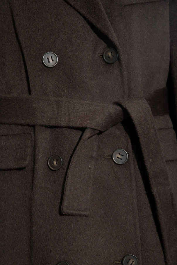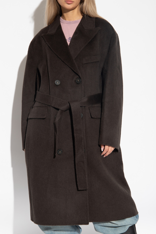Dark grey coat with a collar from Acne Studios. Made in wool and cinched with a tie belt at the waist, this style features a single back vent, button fastenings, two flapped pockets, one slip pocket and long sleeves.