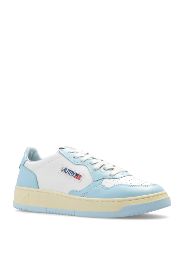 White and blue ‘Medalist’ sneakers from Autry. Made of leather, this lace-up model sits on a cream and blue rubber sole and showcases a raw-trimmed tongue, logo detailing and perforations on the front.