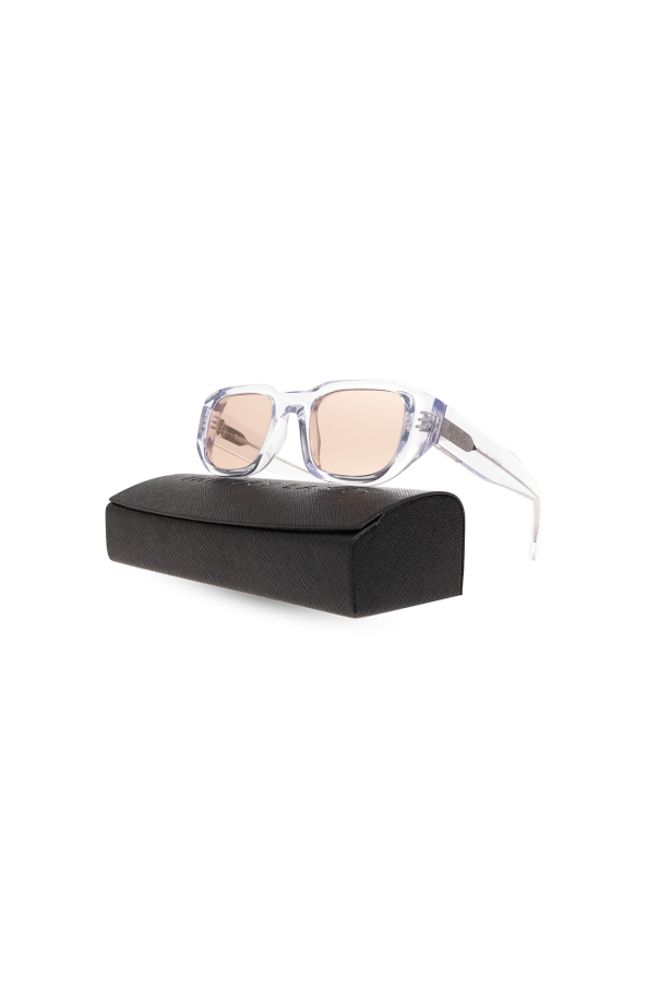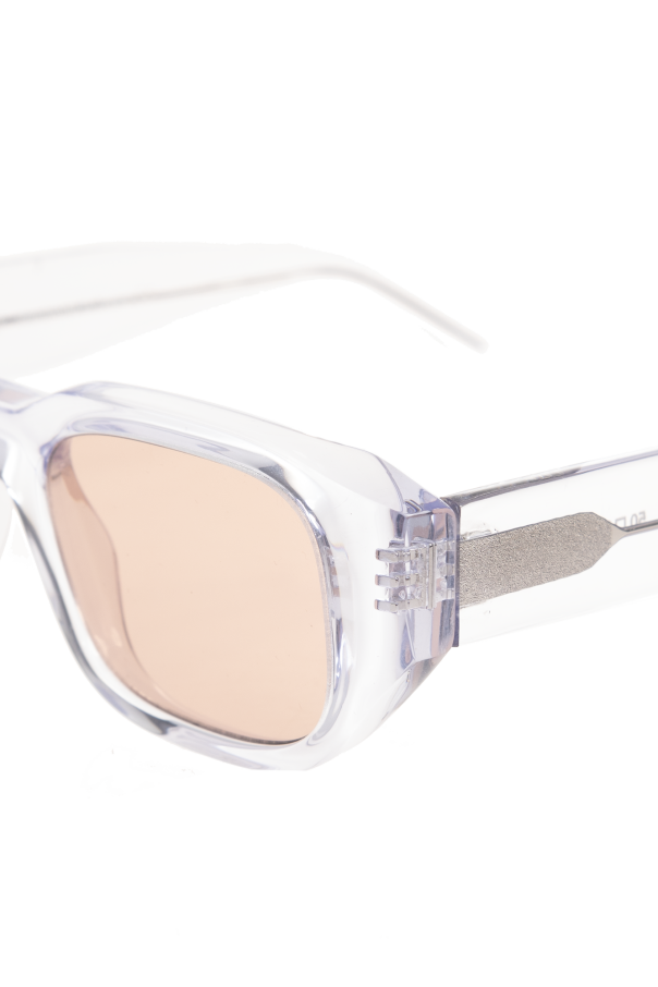 Light blue, transparent ‘Victimy’ sunglasses from Thierry Lasry. Handcrafted in France from authentic Mazzucchelli acetate, this pair has a rectangular frame, silver-tone insert at the temples and pink lenses with 100% UV protection. Comes with a case.