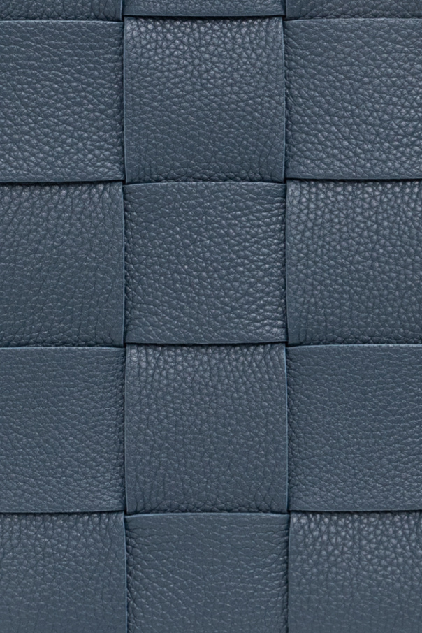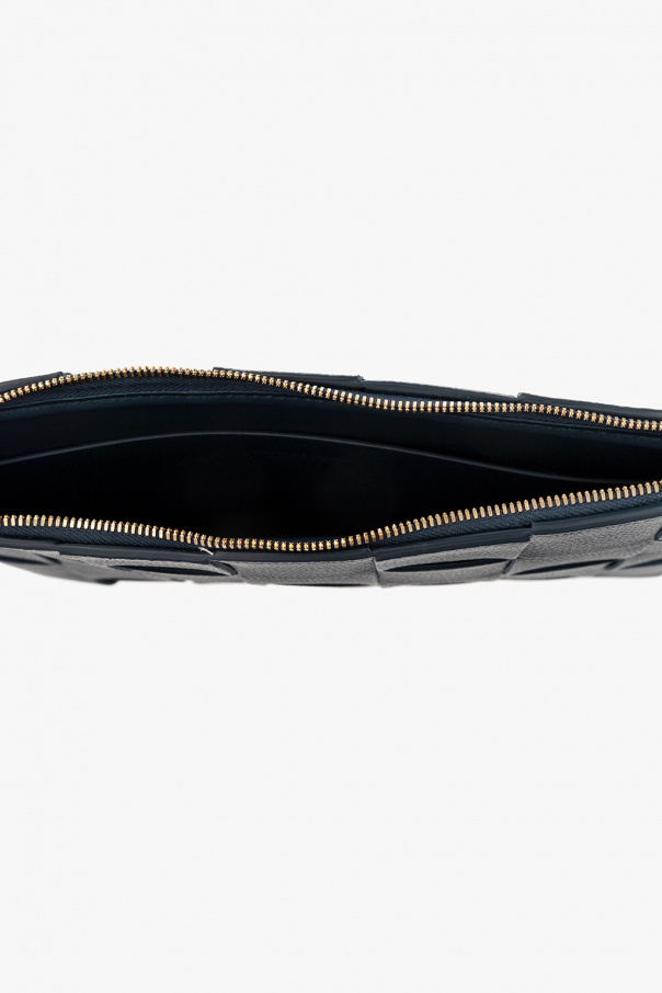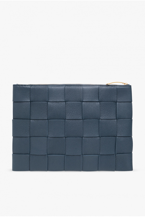 Navy blue ‘Pouch Medium’ clutch from Bottega Veneta. Crafted from a blend of calf leather and lamb leather, this design showcases the brand's signature Intreccio weave. It is complete with a zip fastening, gold-tone metal hardware and one internal compartment with a slip pocket.
