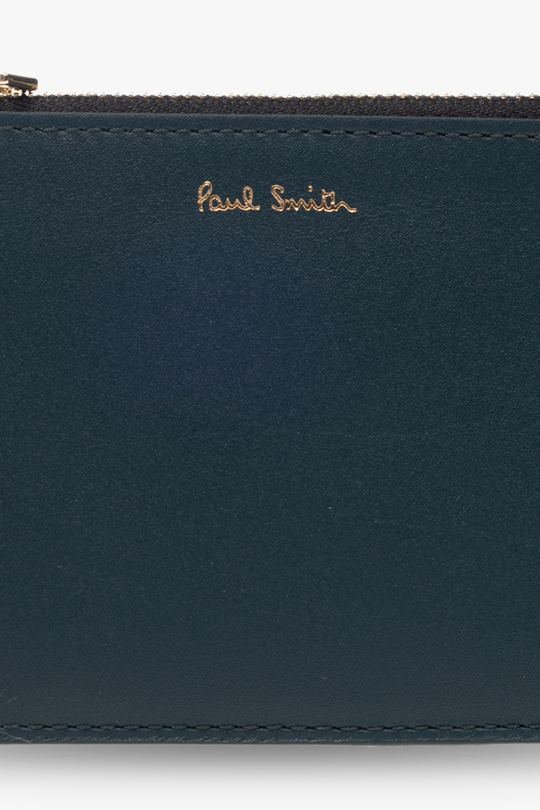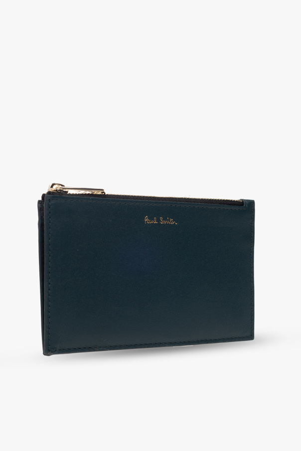 Dark green card holder from Paul Smith. Made of leather, this item features a silver-tone logo print on the front, multicolored stripe pattern at the back, four card slots and a zip pocket.