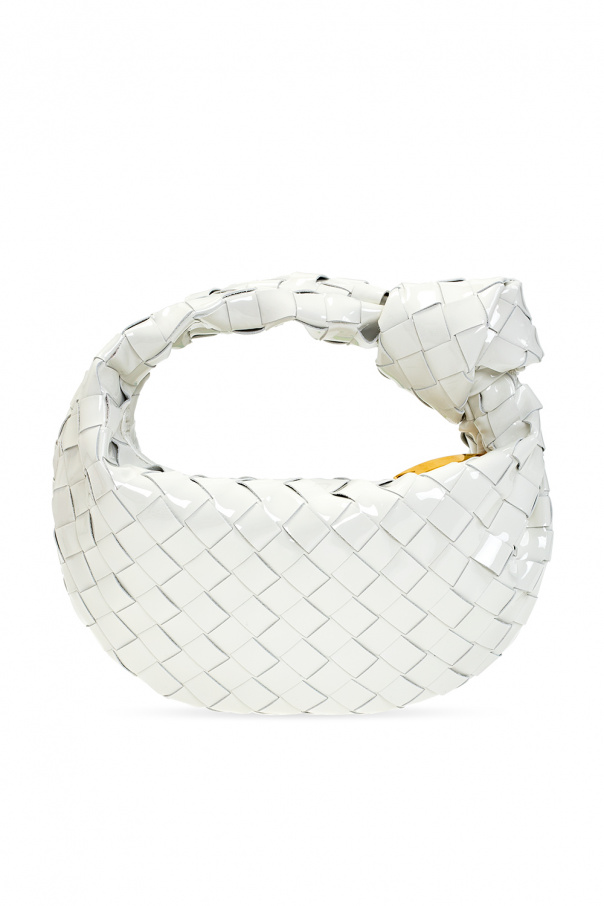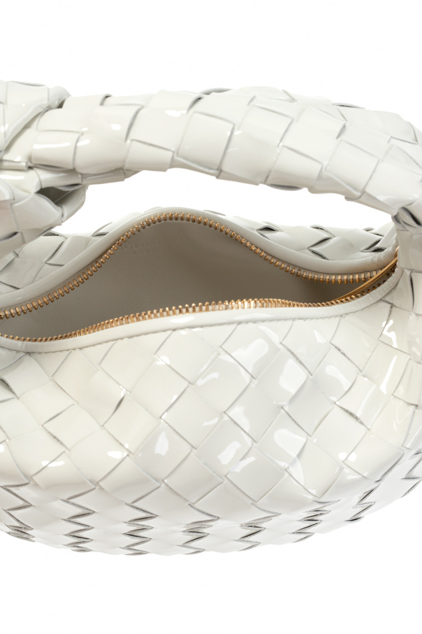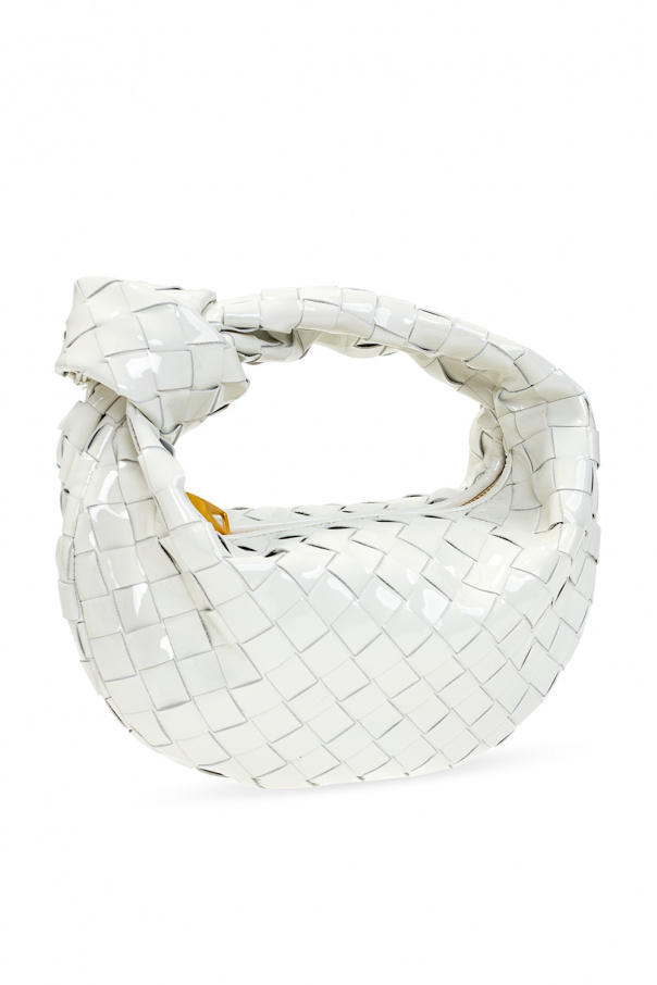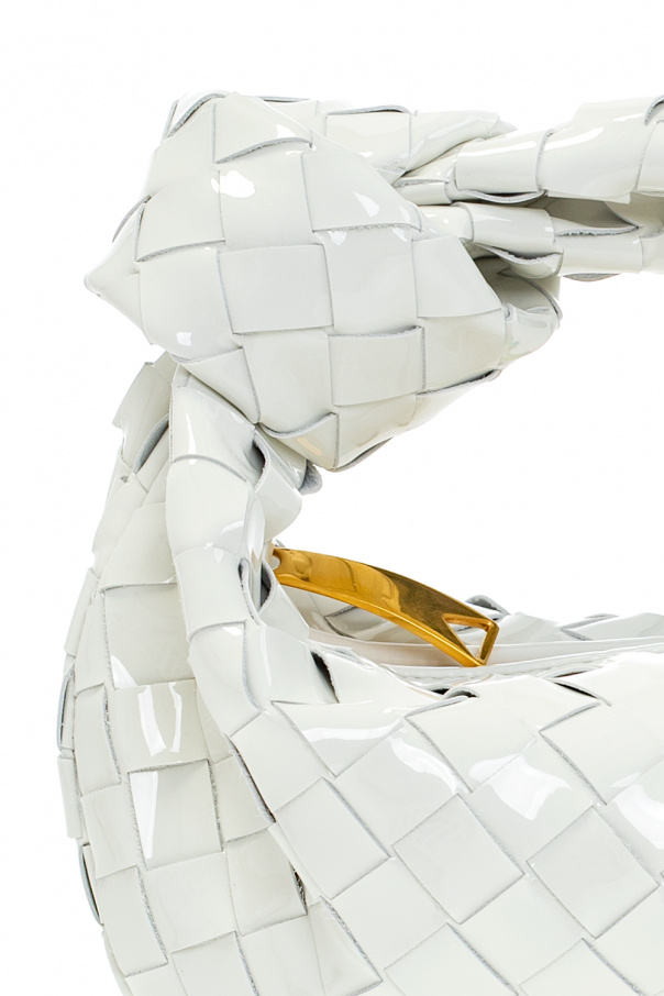 White ‘Jodie Mini’ handbag from Bottega Veneta. Made of patent calf leather with the brand's iconic ‘Intrecciato’ weave, this design features a zip fastening, gold-tone metal hardware and one internal compartment.