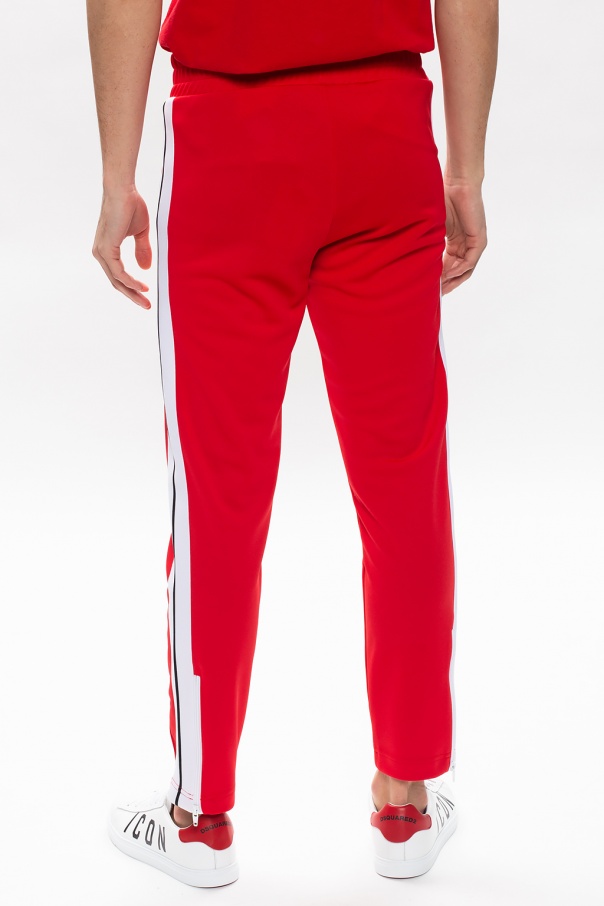 Red sweatpants from Palm Angels. Enriched with white and black panels down the sides and a white logo print, this pair is complete with an elasticated waistband, two side seam pockets and zipped cuffs.