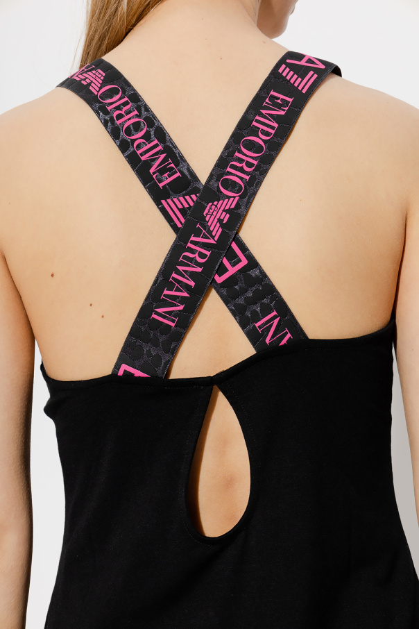 Black tank top from EA7 Emporio Armani. Crafted with VENTUS7 – a flexible technical material offering the right amount of breathability during endurance training and equipped with the Airduct technology and mesh details, this style features a printed gold-tone logo on the front and animal-printed crisscross straps with a neon-hued logo at the back.