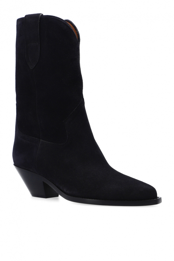 Navy blue ‘Dahope’ heeled ankle boots from Isabel Marant. Made of calf suede, this model features a slip-on silhouette, a pointed toe, distinctive stitching details and a beige leather sole.