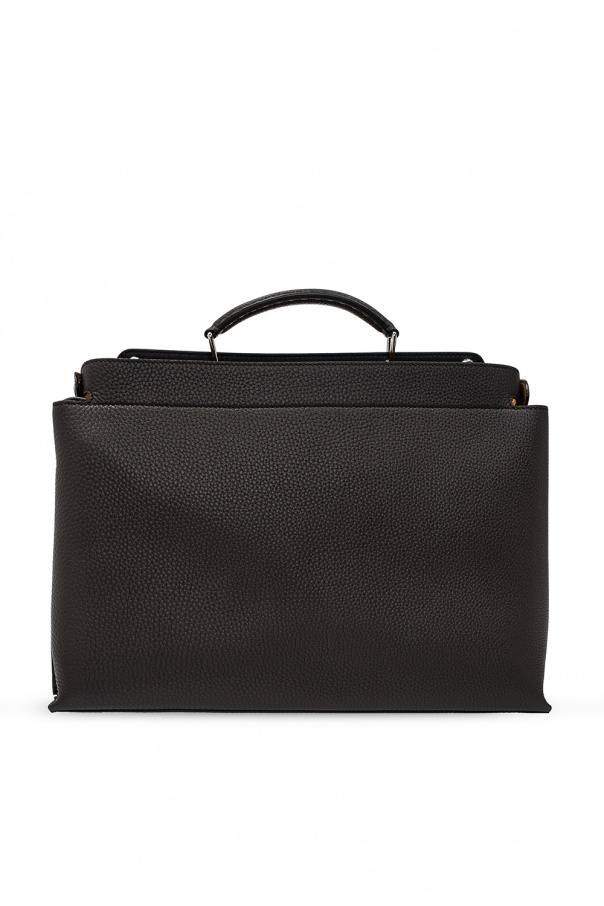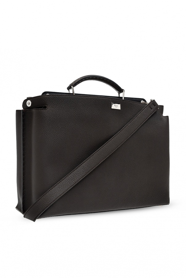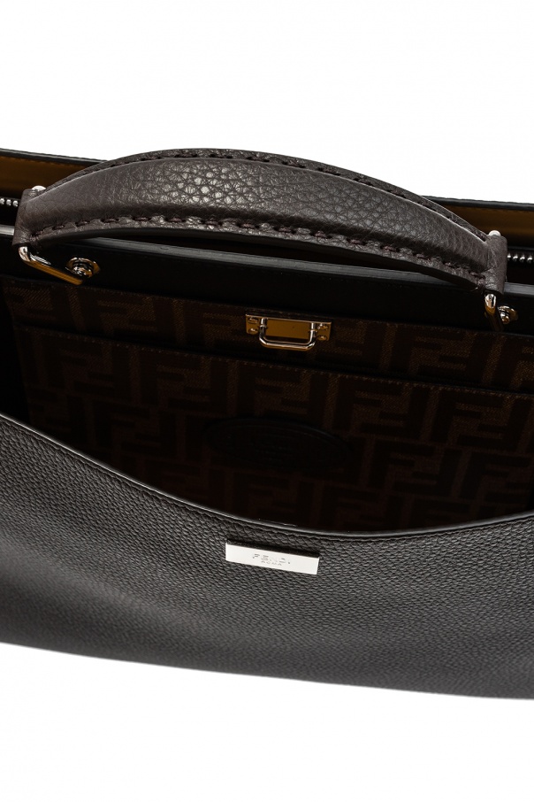 Dark brown ‘Peekaboo’ shoulder bag from Fendi. Crafted from calf leather, this design features two separate compartments – one with snap fastening and one with zip fastening. It is complete with a metal logo applique, half-round handle, detachable and adjustable belt, orange lining and silver-tone metal hardware.