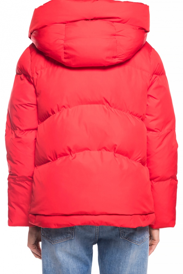 Red ‘Estee’ quilted hooded jacket from AllSaints featuring to-way zip and snap fastenings as well as 2 snap-fastened flap pockets on the front.