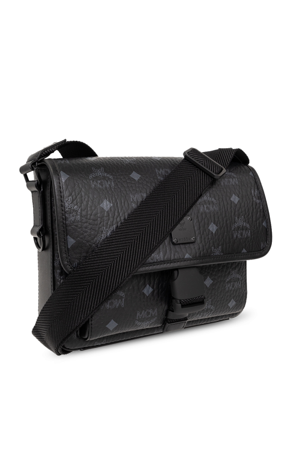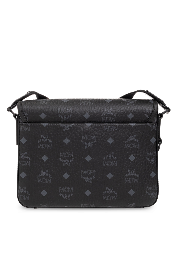 Black shoulder bag from MCM. Crafted from the brand\'s signature Visetos canvas decorated with a grey logo, this design features a strap with a snap closure, a metal logo plaque on the front, a back slip pocket, an adjustable shoulder strap and one internal compartment with one one slip pocket and one zip pocket.
