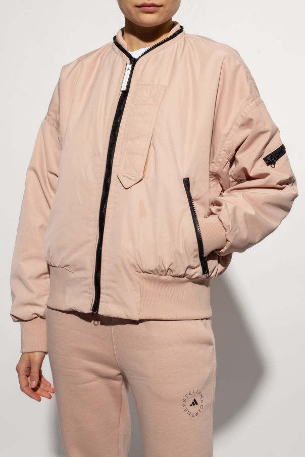 Beige insulated bomber jacket from ADIDAS by Stella McCartney, the ‘End Plastic Waste’ line. Made of recycled materials, this garment features a two-way zip, rubber logo appliqué in black, three zip pockets, one pocket fastened with velcro and ribbed trims at the collar, hem and cuffs.
