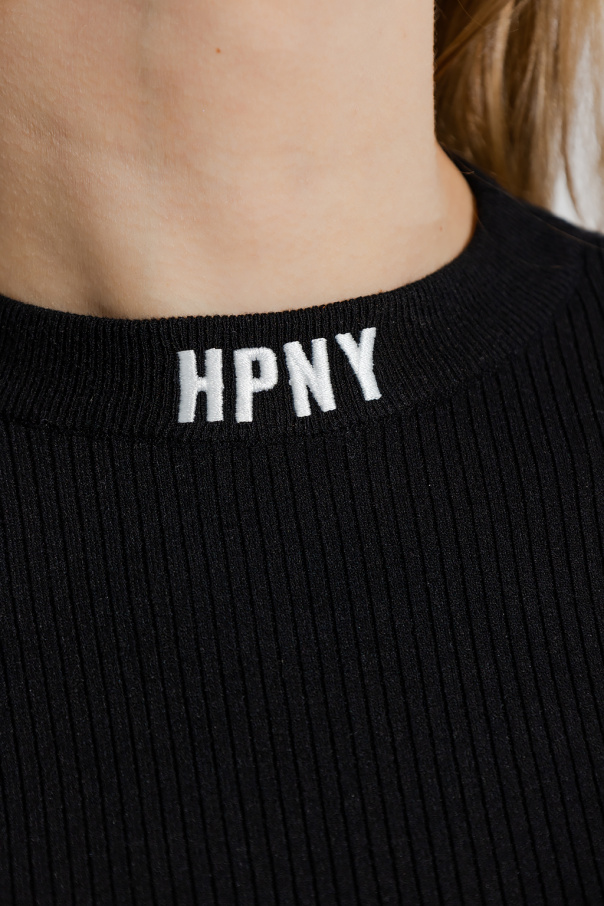 Black ribbed mini dress from Heron Preston. This design features a white logo embroidery and long sleeves with a patch in orange and black.
