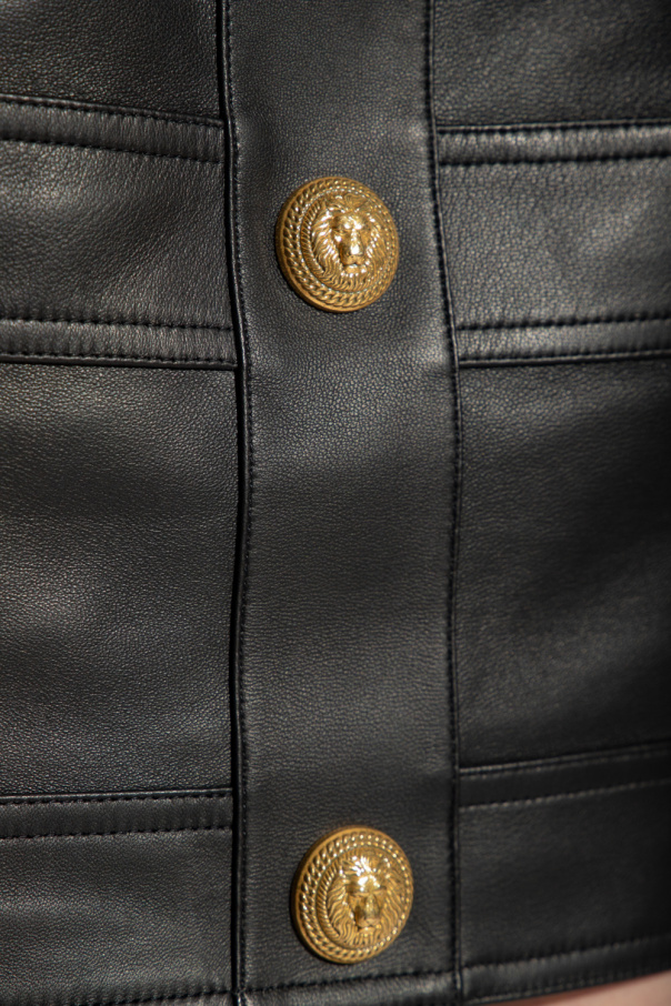Black skirt from Balmain. Crafted from lamb leather, this style features a high-rise waist, decorative gold-tone buttons with the brand\'s signature lion head, exposed stitching details and four slip pockets on the front.