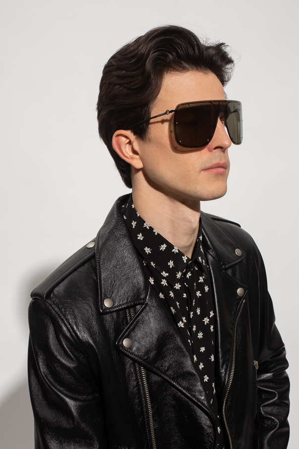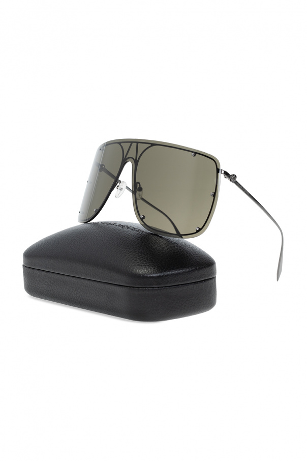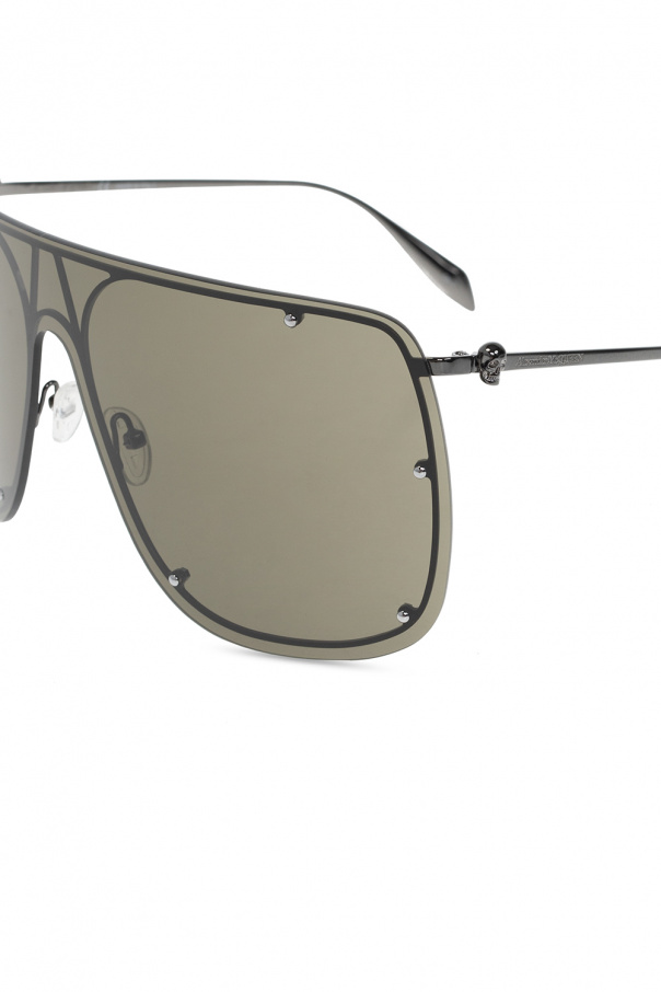 Dark grey sunglasses from Alexander McQueen. Decorated with a logo and skull motif, this pair has certified green lenses with 100% UVA/UVB protection and comes with a black case.
