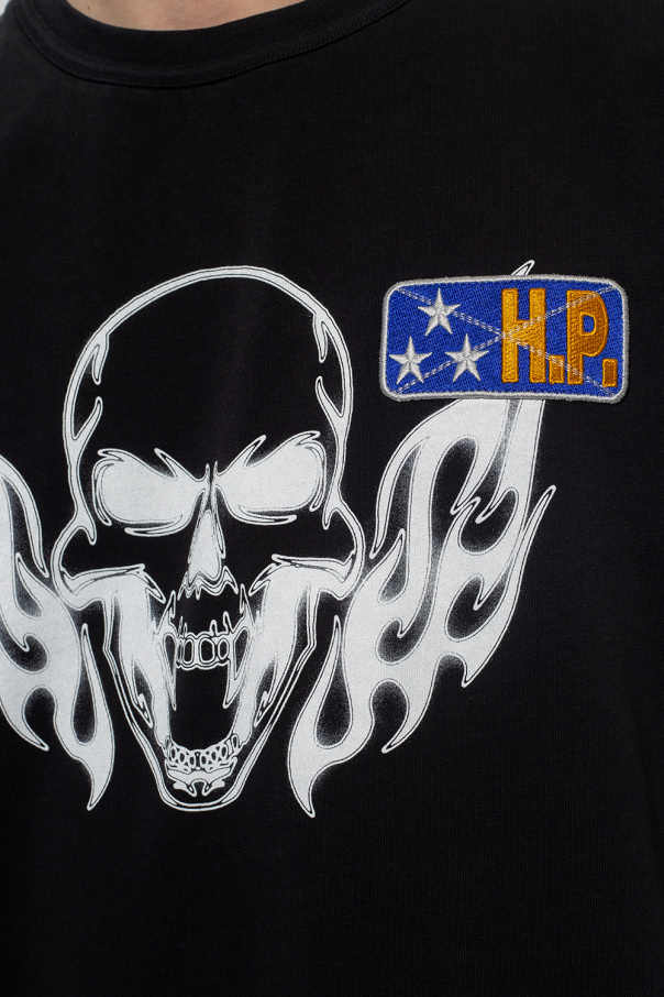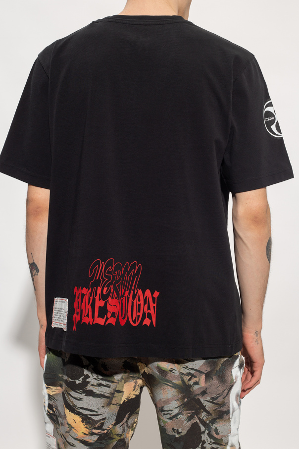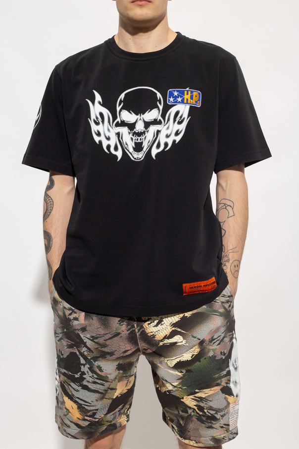 Black crewneck T-shirt from Heron Preston. Made of cotton, this style features short sleeves and a white graphic print accompanied by logo patches.