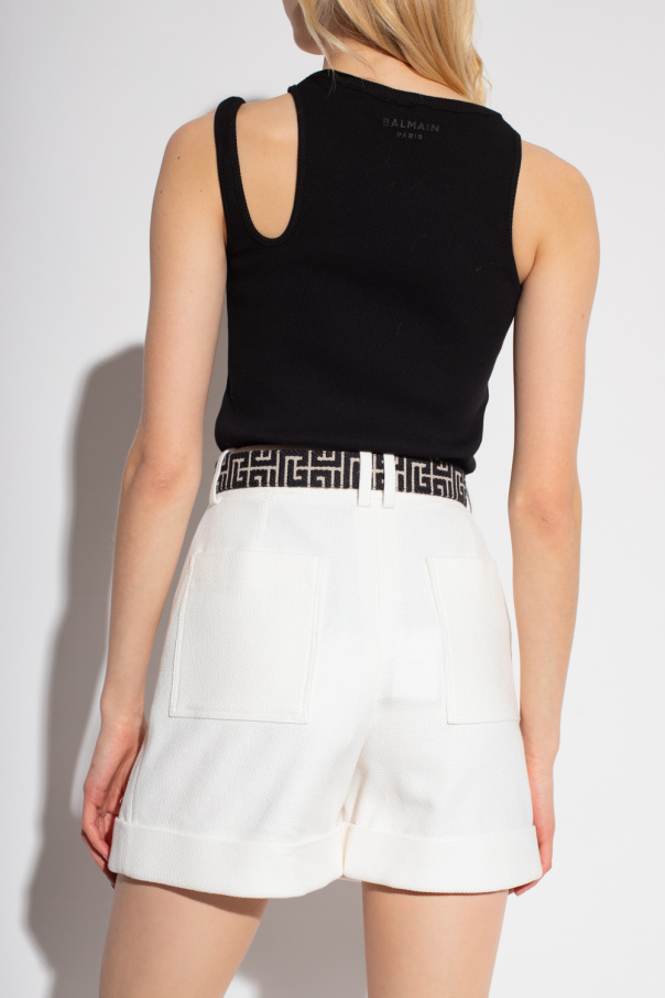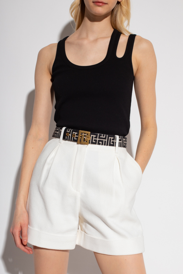 Black tank top from Balmain. Crafted from cotton with a ribbed texture, this style features a round neck and a decorative, additional shoulder strap.