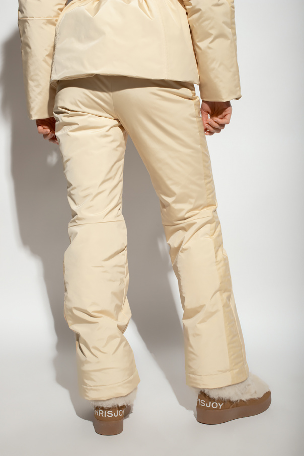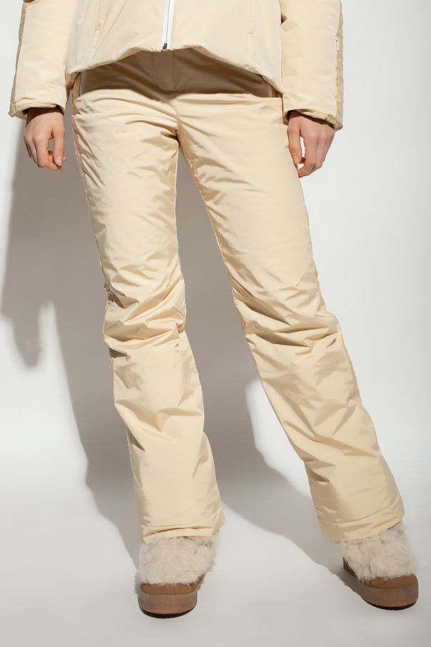 Cream and beige ski trousers from Fendi. Crafted from ECONYL® regenerated nylon with light padding, this pair features a zip fly with snaps, side panels with ‘FF’ monogram, two zipped pockets and straight legs with elasticated cuffs.