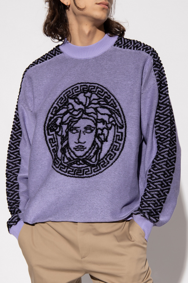 Purple crewneck sweater from Versace. Made of cotton and decorated with black graphic embroidery with the brand's signature Medusa, this style features a black pattern on the sleeves and rib-knit trims on the collar, bottom hem and cuffs.