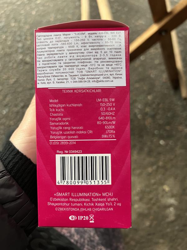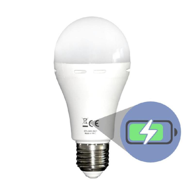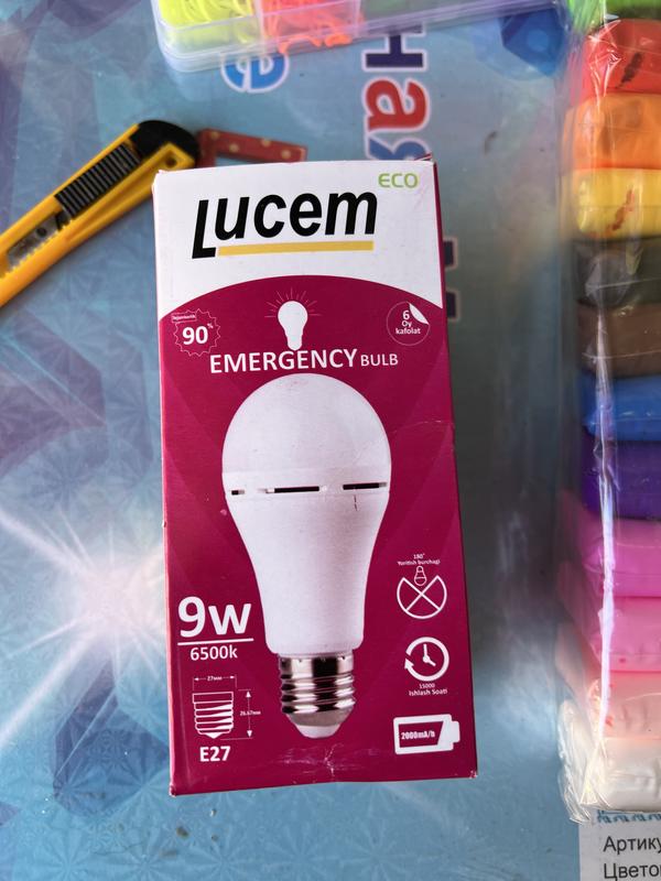 Лампа со встроенным аккумулятором. Время работы от аккумулятора до 4.5 часов. Заряжается во включённом состоянии 5-10 часов. Цоколь Е27. 9W, 6500k. Белый холодный свет. Не использовать при температуре ниже -10° и выше 45°. Аккумуляторная лампа.