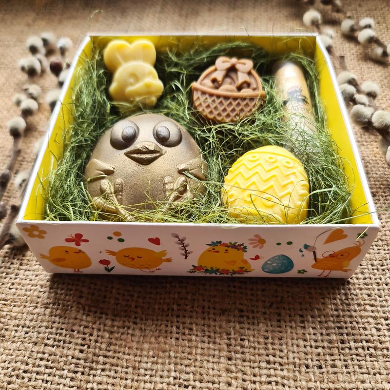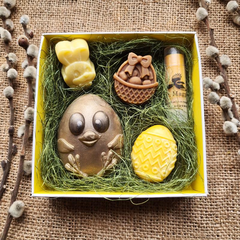 Этот набор в единственном экземпляре. Состоит из: двух кусочков/фигурного натурального мыла, с нуля, (двух сортов): "Карт-бланш" (цыпленок-яйцо), "Мечта безумца" (корзинка). Одного бальзама для губ "Мандариновый шот". И двух массажных плиточек: «Ванильно - медовая» (зайчик) и «Цитрусовая» (яйцо).