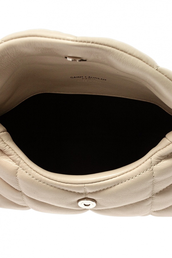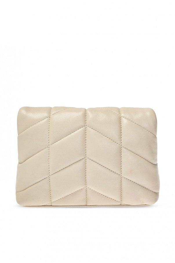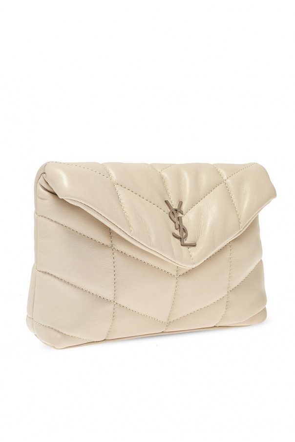 Cream ‘Puffer Small’ quilted clutch from Saint Laurent. Crafted from lamb leather, this design secures with a magnetic snap and features metal YSL initials, silver-tone metal hardware and one internal compartment. It comes with a leather card holder with a logo print, five card slots and one slip pocket.