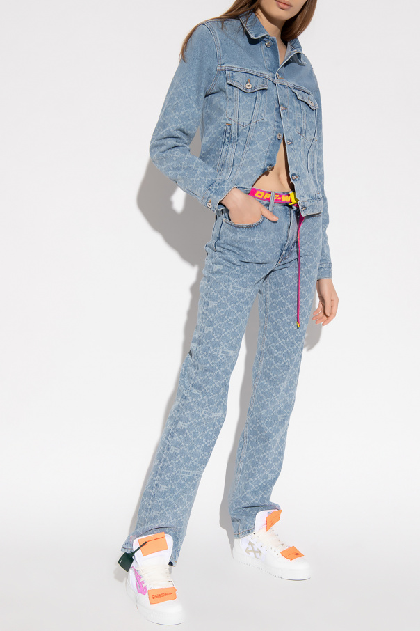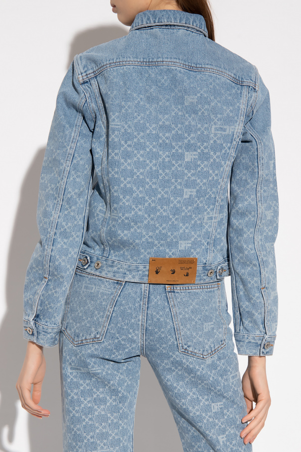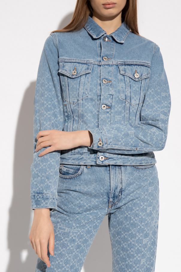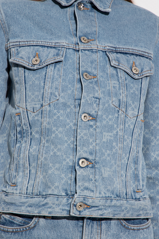 Blue distressed denim jacket from Off-White. Fastened with buttons with a logo, this garment features a monogram pattern, two slip pockets, two buttoned flap pockets and long sleeves.