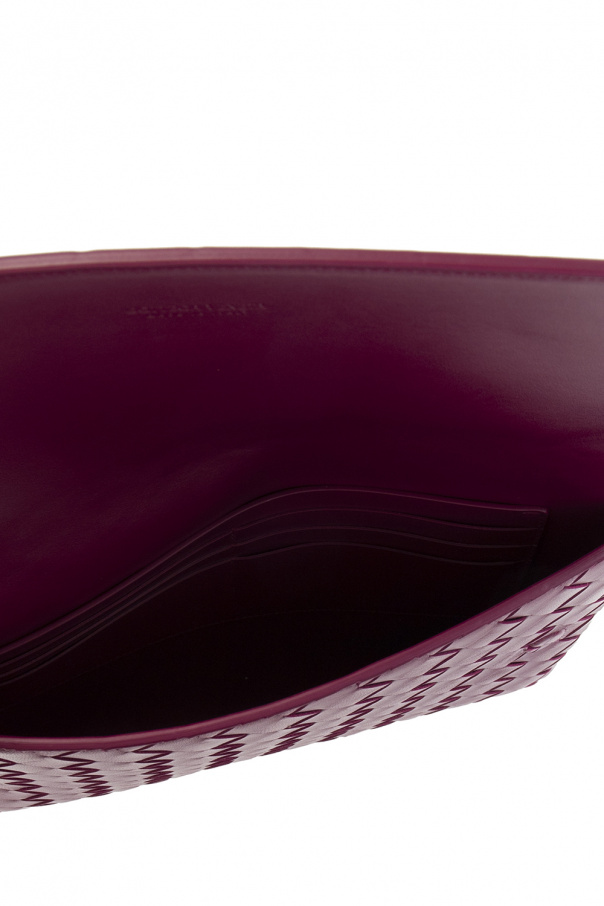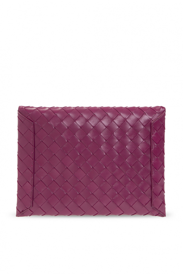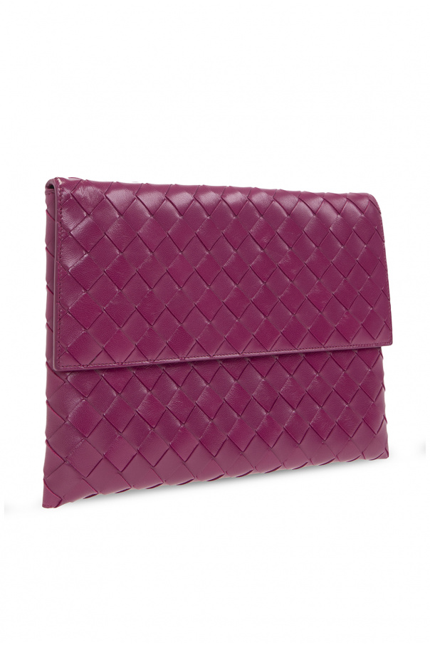 Dark pink ‘Flap’ clutch from Bottega Veneta. Embellished with the brand's iconic Intrecciato weave, this design features a magnetic fastener and one internal compartment with one slip pocket and six card slots.