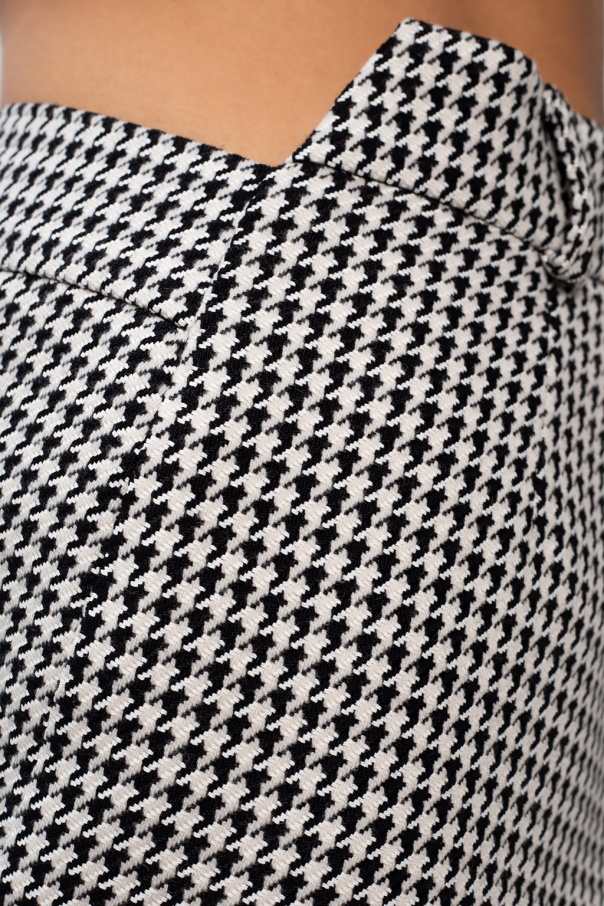 Black and white skirt from Balenciaga. Rendered in wool blend with houndstooth check pattern, this asymmetrical design is complete with zip and button fastenings on the back as well as an antique gold-tone metal logo plaque on the front.