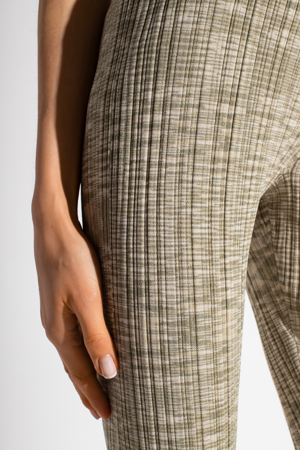 Green and beige ‘Dahlia’ trousers from Holzweiler. This flared design features an elastic waistband and ruffle trims.