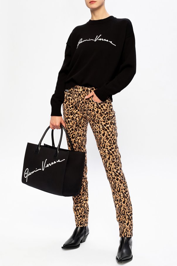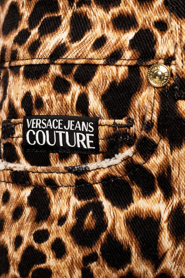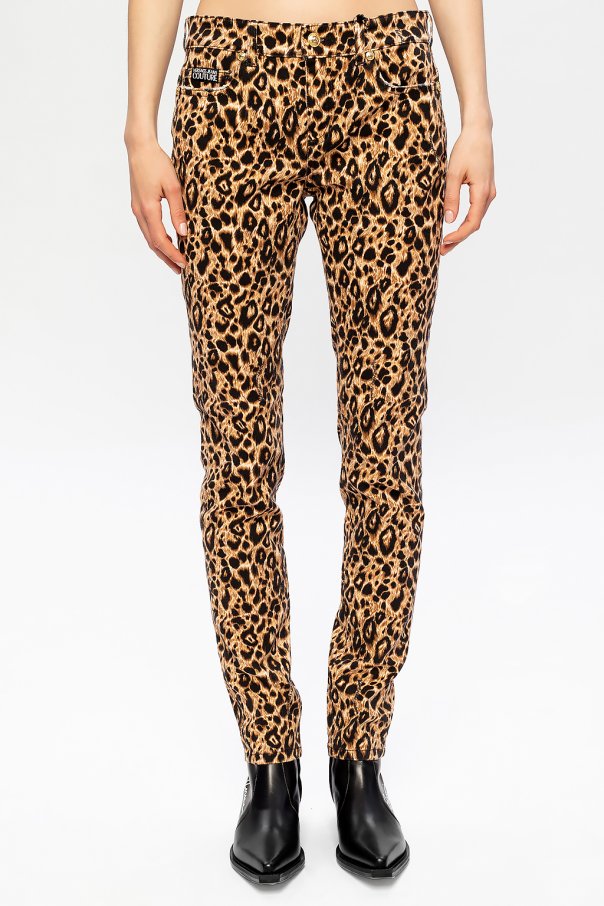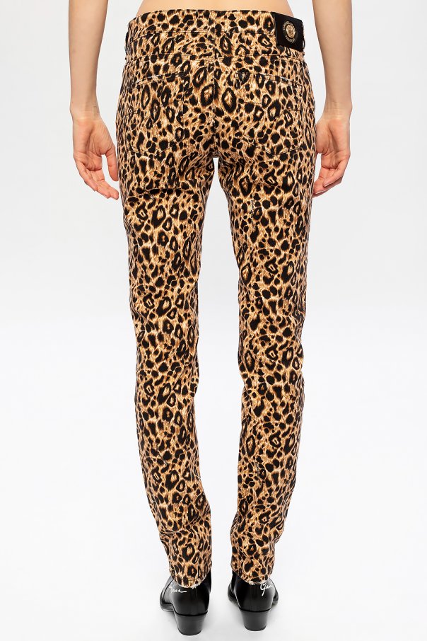 Beige and black jeans from Versace Jeans Couture. Crafted from stretch cotton, this leopard-printed pair comes with classic zip fly accompanied by gold-tone logo engraved button as well as three pockets on the front and two on the back.