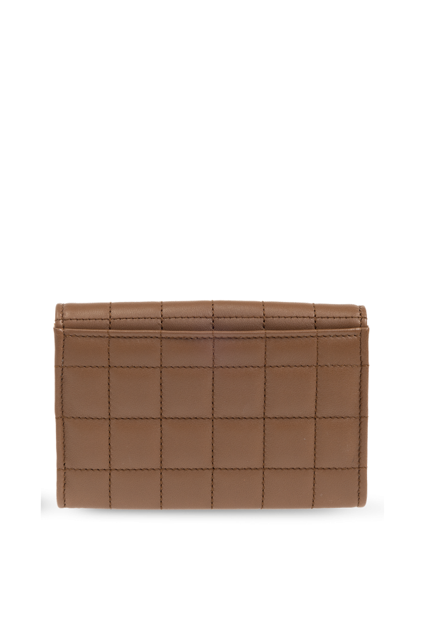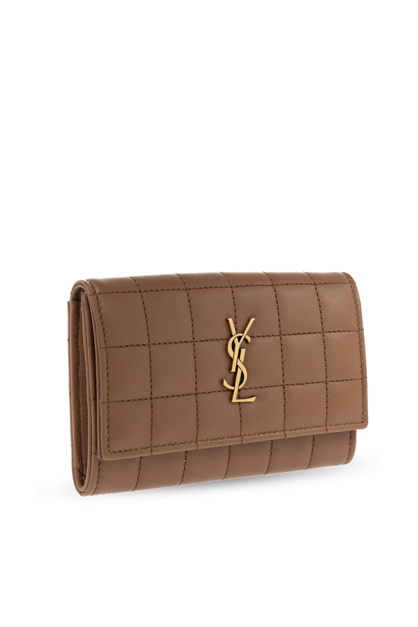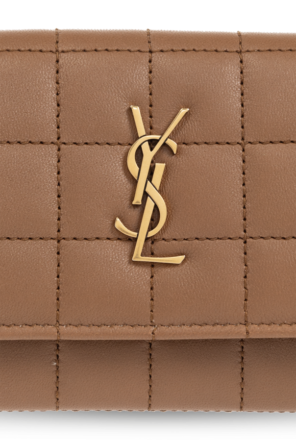 Brown quilted wallet from Saint Laurent. Made of lamb leather, this item features a snap closure, gold-tone logo detail on the front, slip pocket to the back and one internal compartment with four card slots.