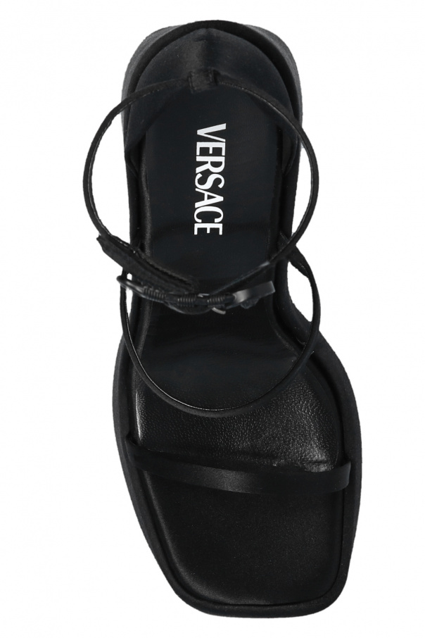 Black ‘Triplatform’ wedge sandals from Versace. Crafted from satin, this pair features an ankle strap with a Medusa head safety pin, embossed logo on the front and back, square toe and black leather sole trimmed with rubber.