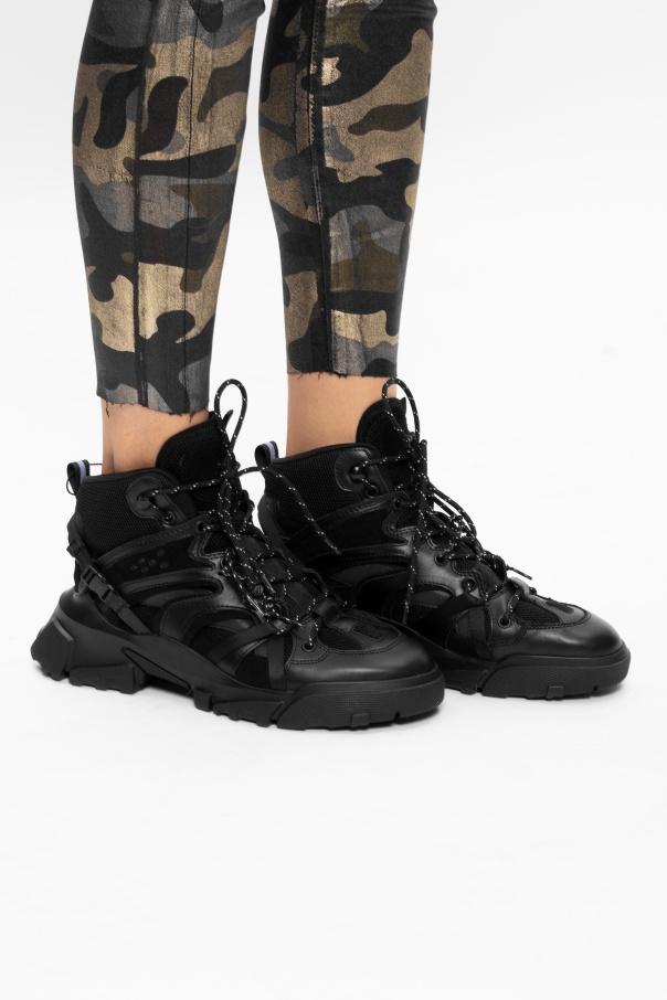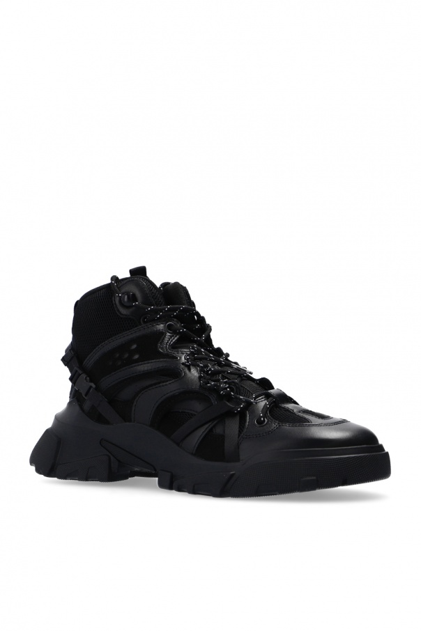 Black ‘Orbyt’ high-top sneakers from No. 0 by MCQ. Showcasing logo patch on the tongue, this lace-up pair sits on a black ridged rubber sole and features contrasting leather and mesh panels, cut-out details and buckle strap at the heel counter.