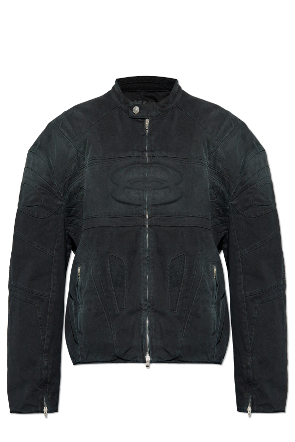 Introducing the Black Denim Jacket with Logo by the illustrious Balenciaga. This exquisite piece, crafted from premium, thick-woven denim, epitomizes durability and sartorial elegance. Its classic motorcycle silhouette, complete with straight lines and a slightly tailored fit, exudes an aura of effortless sophistication. The jacket\'s monochromatic black hue is punctuated by a discreet yet distinguished embossed designer logo on the chest, infusing a touch of prestige. Practicality meets style with long sleeves ending in zippered cuffs, a robust full-length metal zipper, and two front pockets secured with zippers for your essentials. Designed with meticulous attention to detail, the jacket features a button-fastened stand collar that enhances its timeless appeal. Additional stitching and reinforcements on the back and sleeves lend character and resilience, while the slightly oversized fit offers a relaxed yet refined look. Why Buy This Product? Iconic design by Balenciaga, a renowned name in haute couture. High-quality denim ensures longevity and comfort. Elegant embossed logo for a touch of exclusivity. Functional and stylish with multiple zippered pockets. Versatile and perfect for casual and streetwear ensembles.
