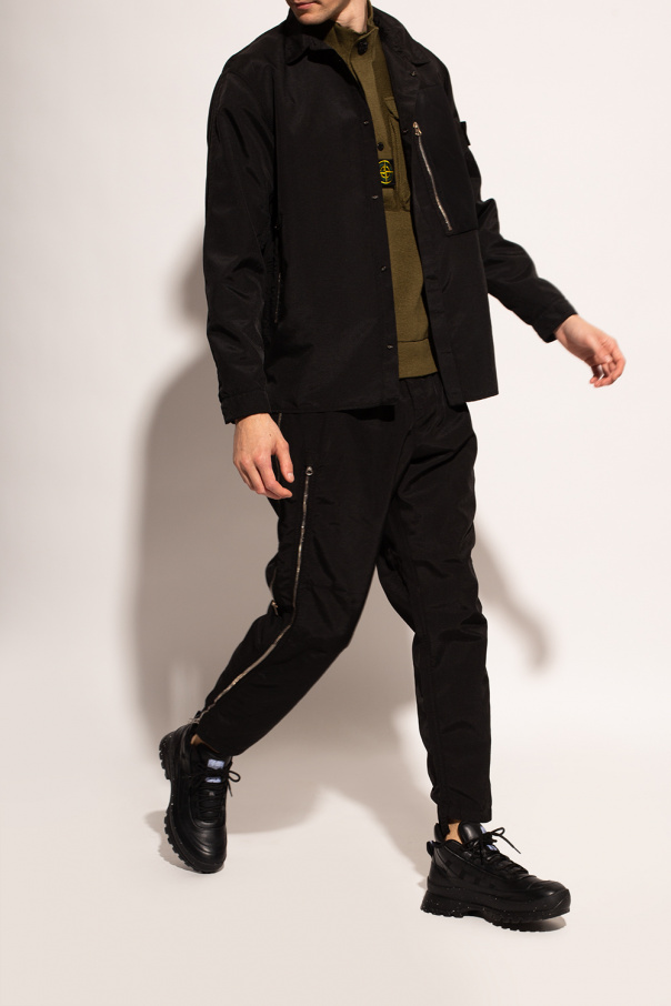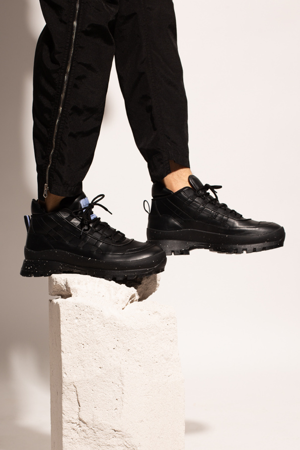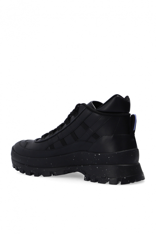 Black ‘FA – 5 Hiking’ sneakers from McQ, the ‘No. 5’ collection. Boasting a high-top silhouette, this lace-up pair sits on a black rubber sole with Vibram technology, which is being used in mountaineering footwear, and features a leather upper with a light blue logo patch on the tongue.