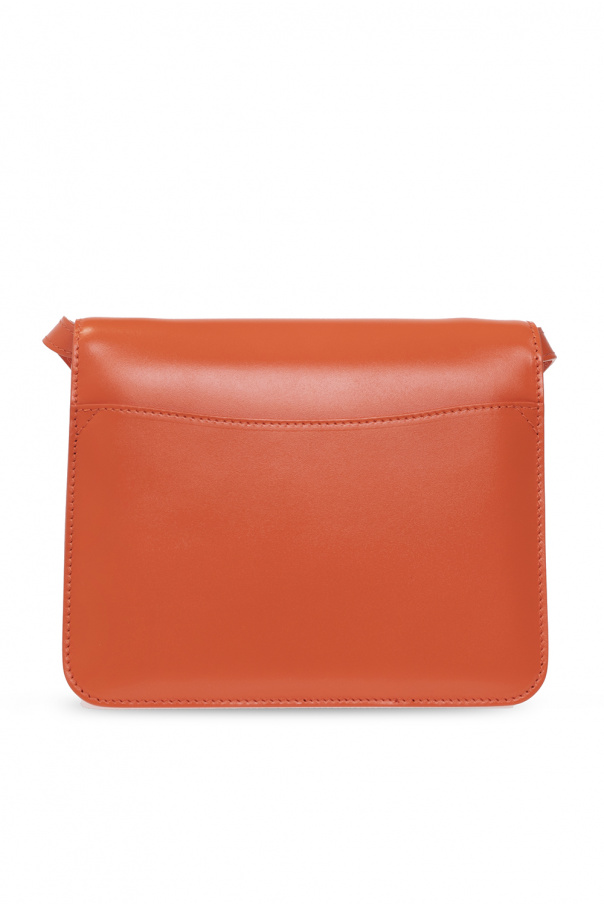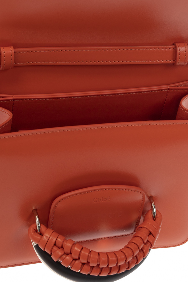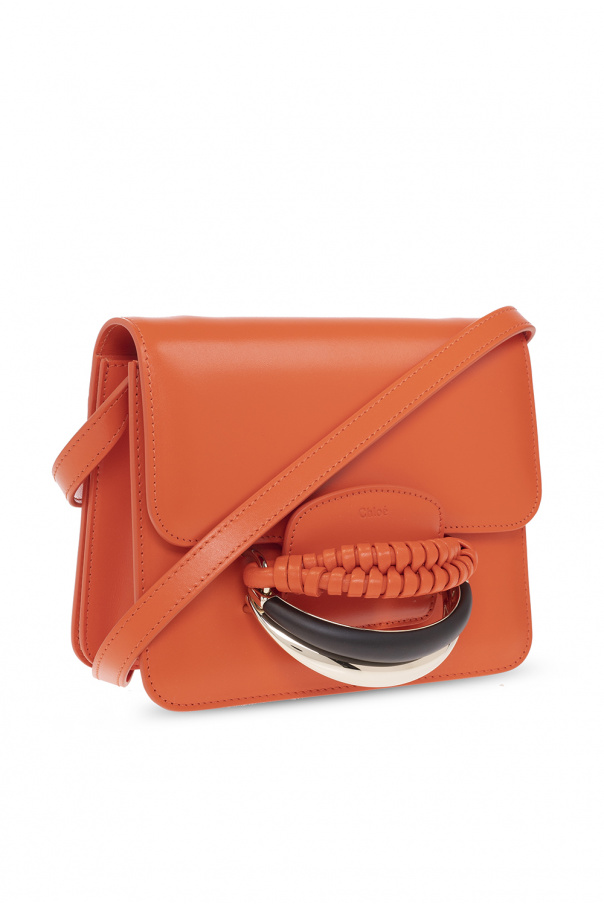 Reddish orange ‘Kattie’ shoulder bag from Chloé. Made of calf leather, this model features a snap closure, decorative triple handle with wood, brass and leather trims, back pocket, adjustable strap, gold-tone metal hardware and one internal compartment with one slip pocket and one card slot.