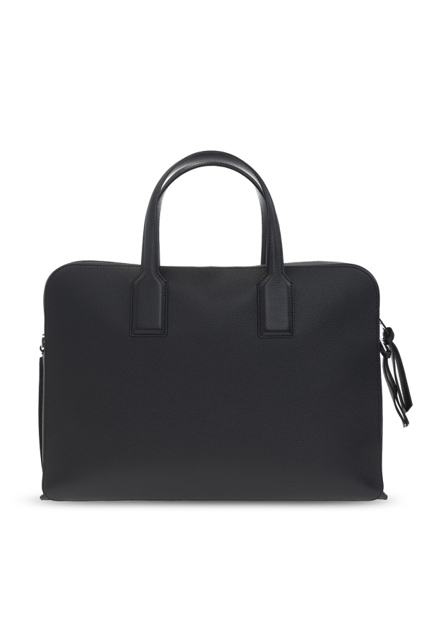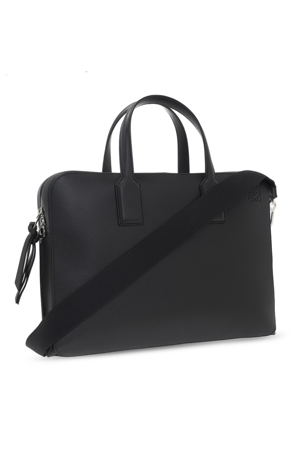 Black ‘Goya’ briefcase from Loewe. Crafted from calf leather, this model fastens with a two-way zip and is complete with an embossed logo, two half-round handles, detachable shoulder strap, silver-tone metal hardware and one internal compartment with three slip pockets and one zip pocket.