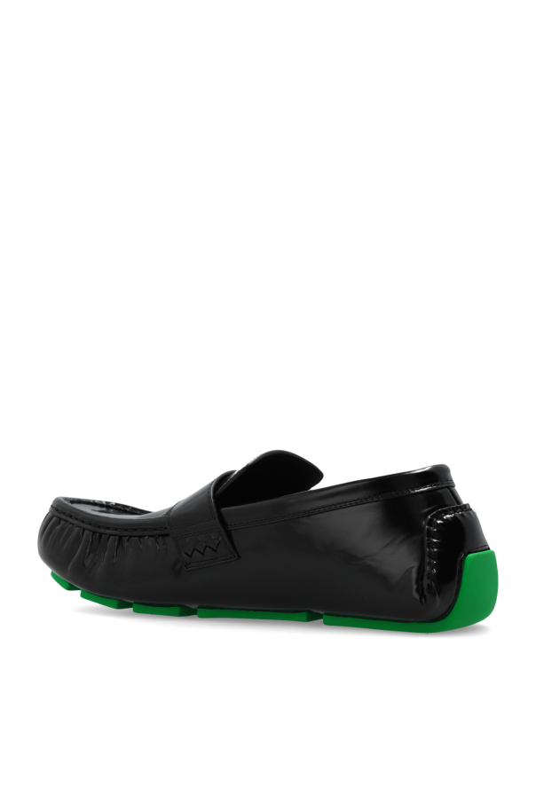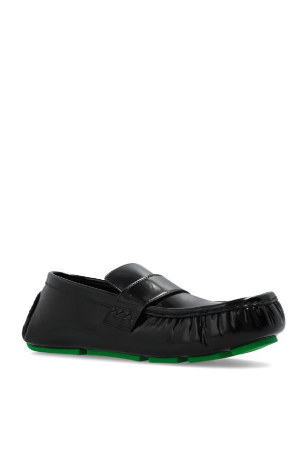Black ‘Ride’ moccasins from Bottega Veneta. Made of polished leather, this pair features a decorative strap and green rubber sole.