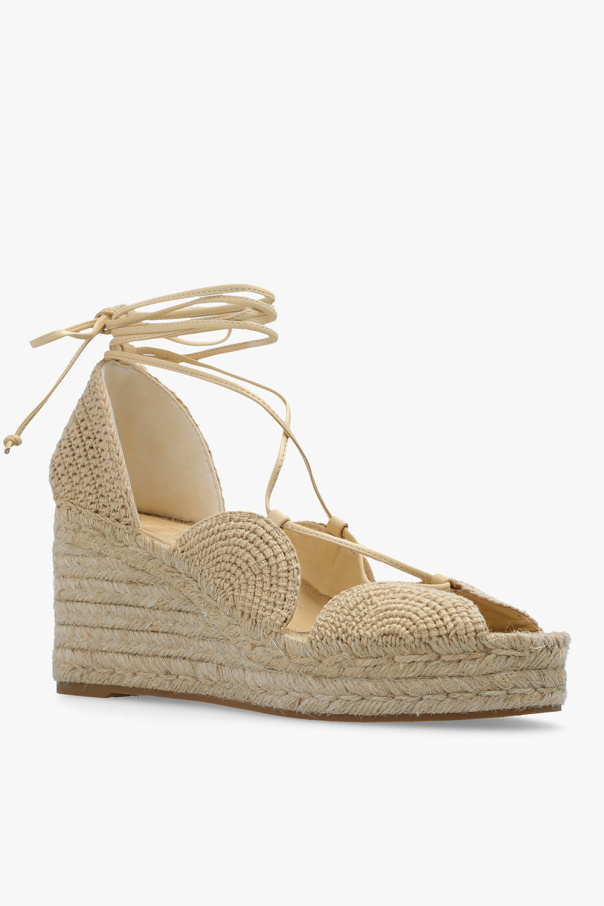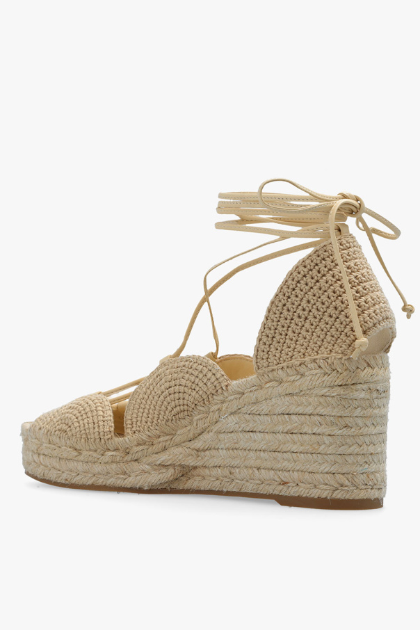 Beige ‘Solar’ crochet wedge sandals from Loewe x Paula’s Ibiza. Enriched by leather tie fastenings, this pair is set on a woven jute midsole with a brown rubber outsole.