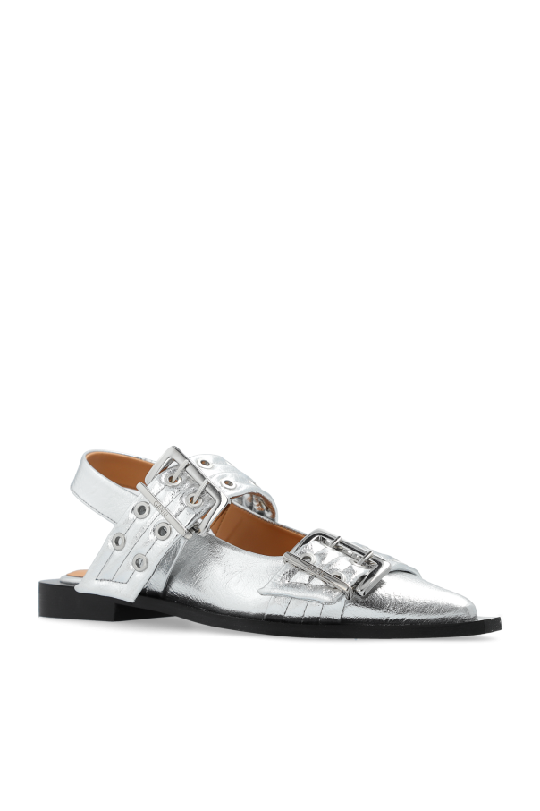Introducing the Ganni Buckle Shoes, a masterpiece of modern elegance and comfort. These medium-heeled shoes are crafted from a shimmering, metallic material in a striking silver hue, showcasing an avant-garde aesthetic. The pointed toe silhouette adds a touch of sophistication, making them a perfect blend of contemporary style and timeless grace. The shoes boast a trio of silver-toned buckles across the vamp, each lending an air of exclusive design and character to the ensemble. This key decorative feature harmonizes with the metallic finish, elevating the shoes\' allure. Designed with a flat sole for ultimate comfort, these shoes do not compromise on wearability despite the inclusion of a heel. An open back with an ankle strap ensures a secure fit and stability, enhancing the practical aspects of this luxurious footwear. The interior, possibly crafted from smooth leather, contrasts with the external glimmer, signifying a commitment to quality and comfort. These shoes, with their unique silver color and buckled detailing, are destined to be a standout piece in any luxury apparel collection, embodying the refined design ethos of renowned designer Ganni. Why Purchase This Product? Elegant, pointed-toe design with a modern twist. Triple buckle decoration for a distinctive, stylish appearance. Constructed entirely from high-quality rubber, ensuring durability and comfort. Flat sole design for day-long comfort without sacrificing style. Exquisite craftsmanship and attention to detail, indicative of the Ganni brand. Unique metallic silver finish, perfect for making bold fashion statements.