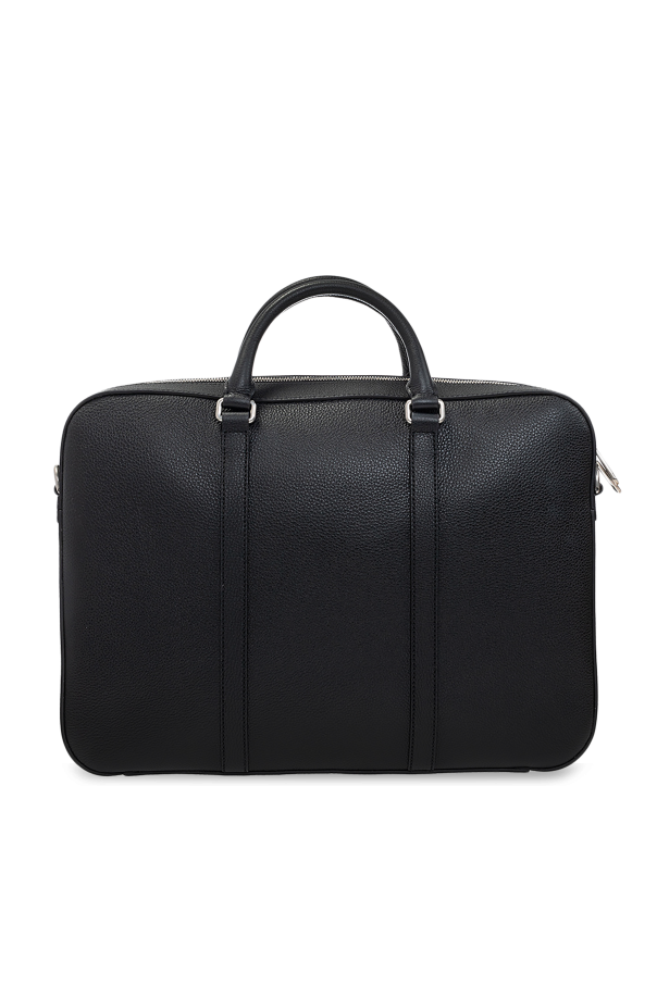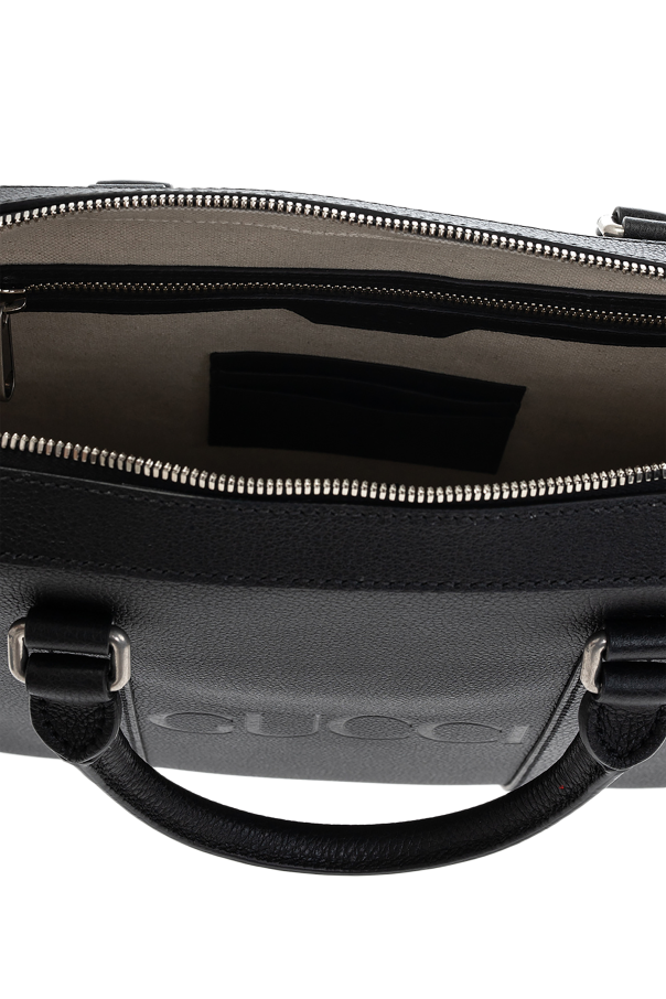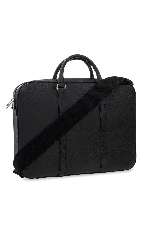 Black briefcase from Gucci. Made of leather. Fastened with a two-way zip, this garment features an embossed logo in black, two half-round handles, adjustable shoulder strap and one internal compartment with one slip pocket, one zip pocket and two card slots.