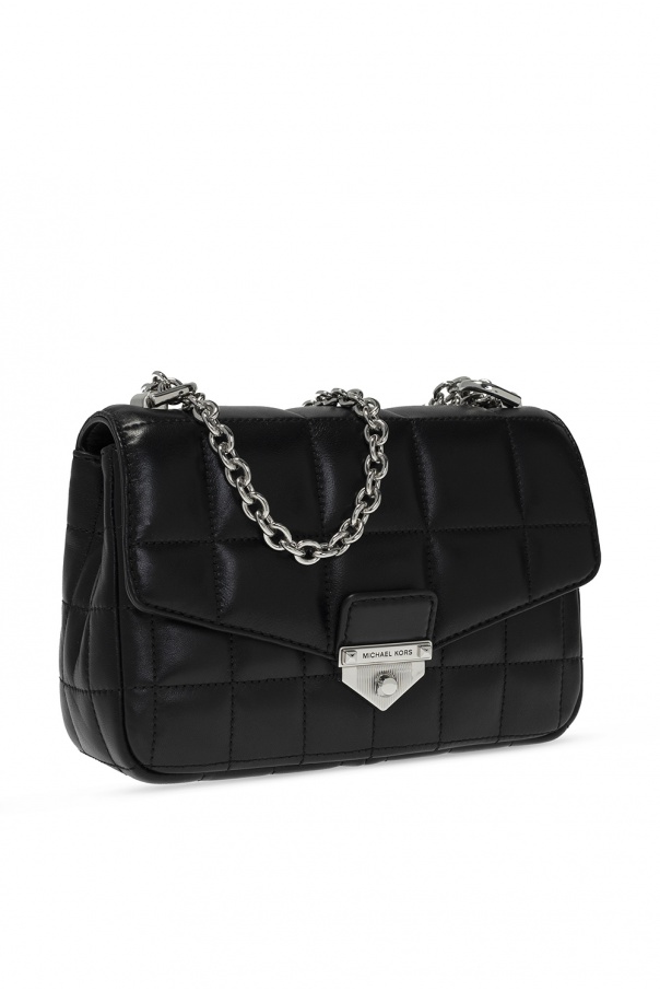 Black ‘Soho’ quilted shoulder bag from Michael Michael Kors. Crafted from leather, this item secures with a silver-tone fastener with an embossed logo, and features a pocket with magnetic closure on the back, a chain strap, silver-tone metal hardware and interior with two compartments, two zip pockets and one slip pocket.