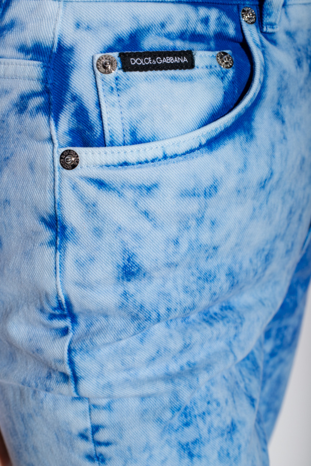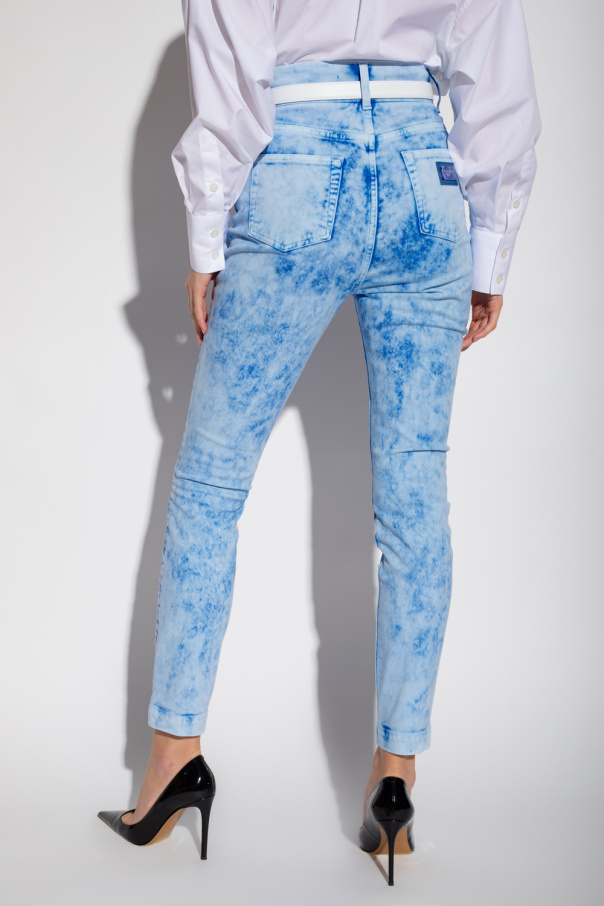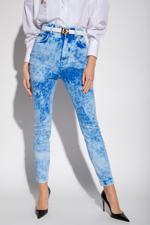 Blue jeans from Dolce & Gabbana. Enriched by a tie-dye motif, this pair features a high-waisted silhouette, a zip fly with a button, classic five pockets, a metal logo plaque and tapered legs.