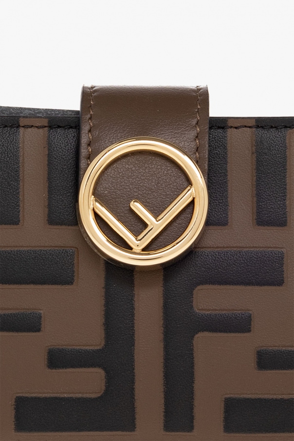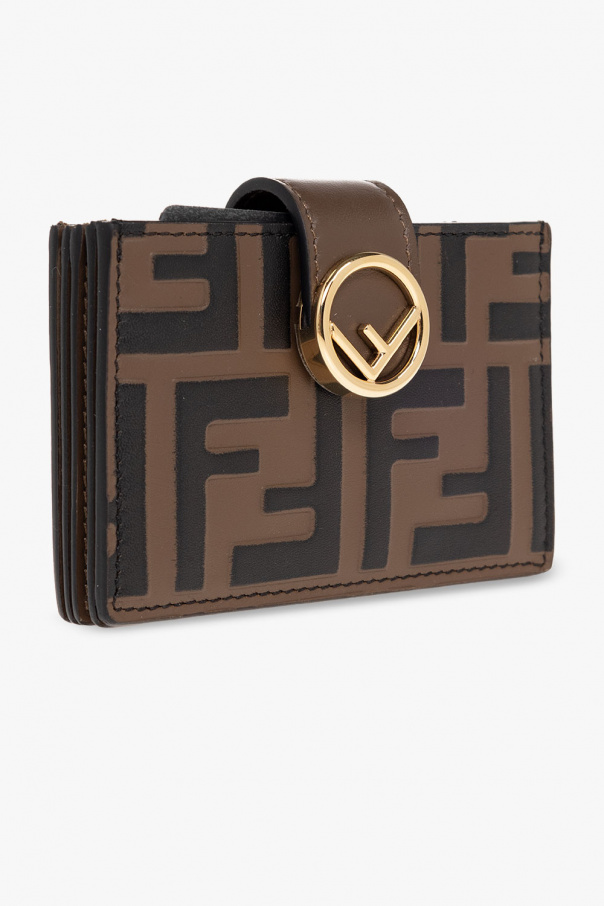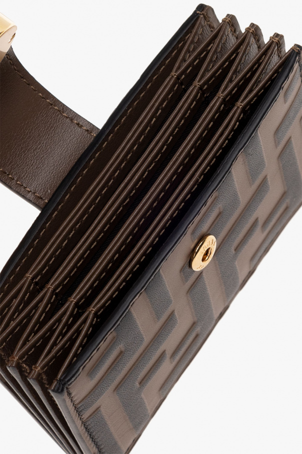 Brown and black card holder from Fendi. Crafted from calf leather, this item features a snap closure with a round logo appliqué in gold-tone, raised FF monogram pattern and five internal card slots.