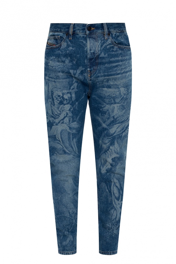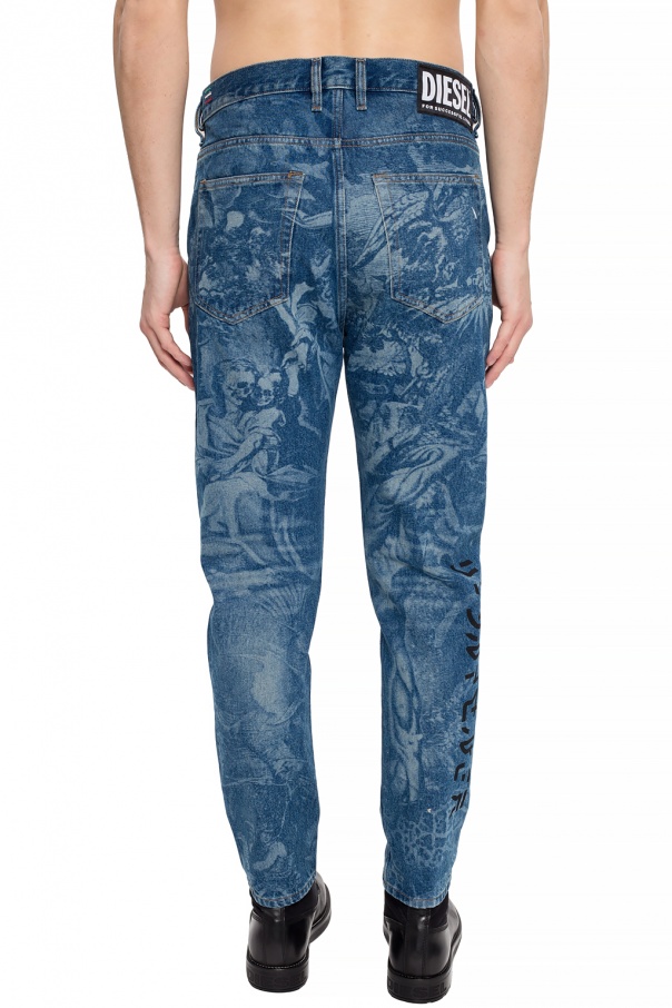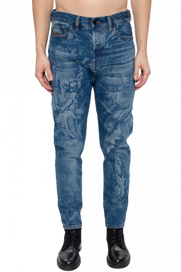 Navy blue ‘D-Vider-Sp4’ jeans from Diesel featuring zip fly with top button fastening, four slip pockets and black and white logo patch.