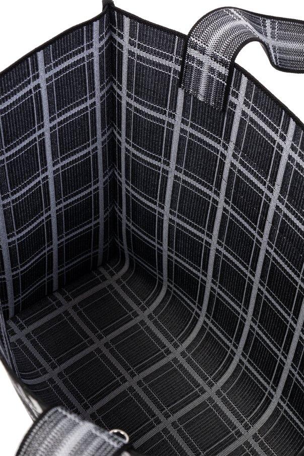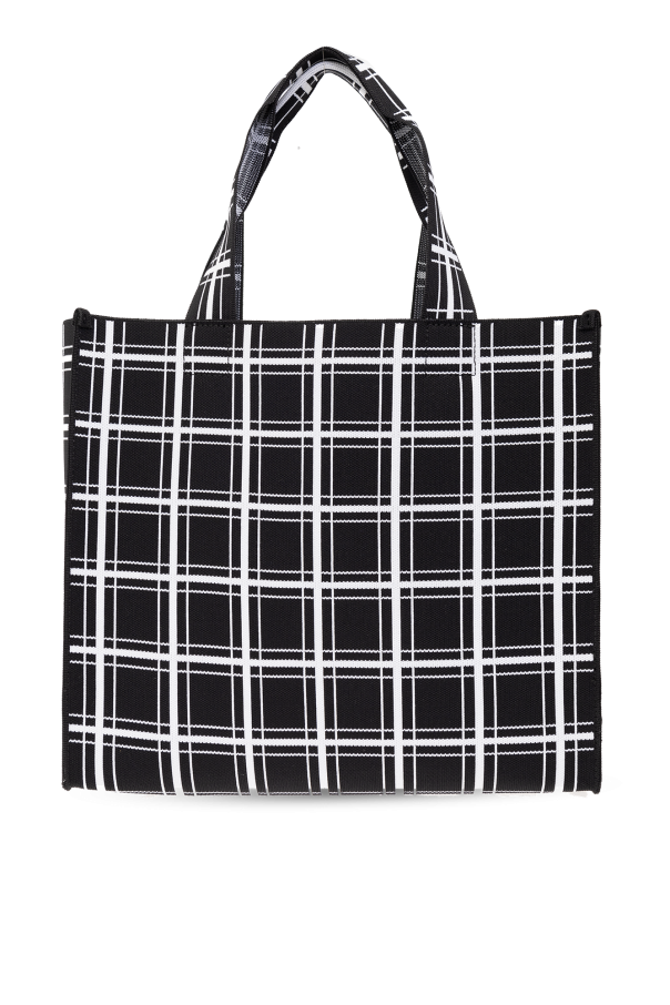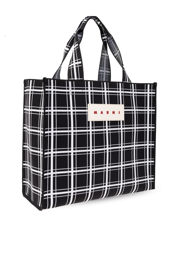 Black and white shopper bag from Marni. Decorated with a check pattern, this model features a rubber logo patch, two handles and one internal compartment with a removable zipped pouch.