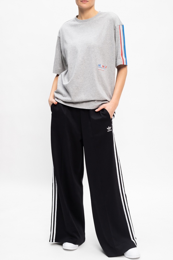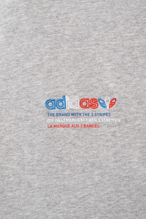 Grey crewneck T-shirt from ADIDAS Originals. Crafted from cotton, this design features a blue, white and red logo embroidery and the iconic three stripes.