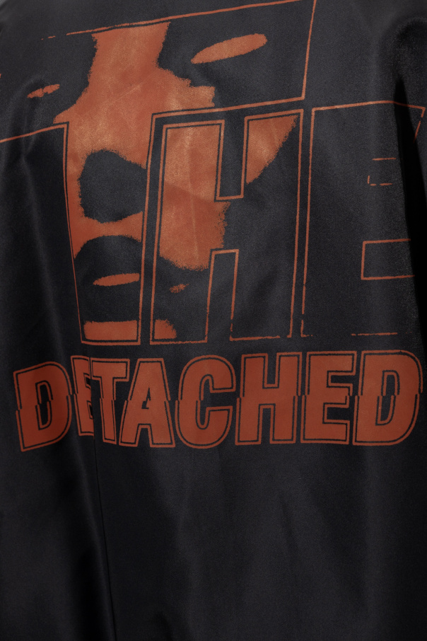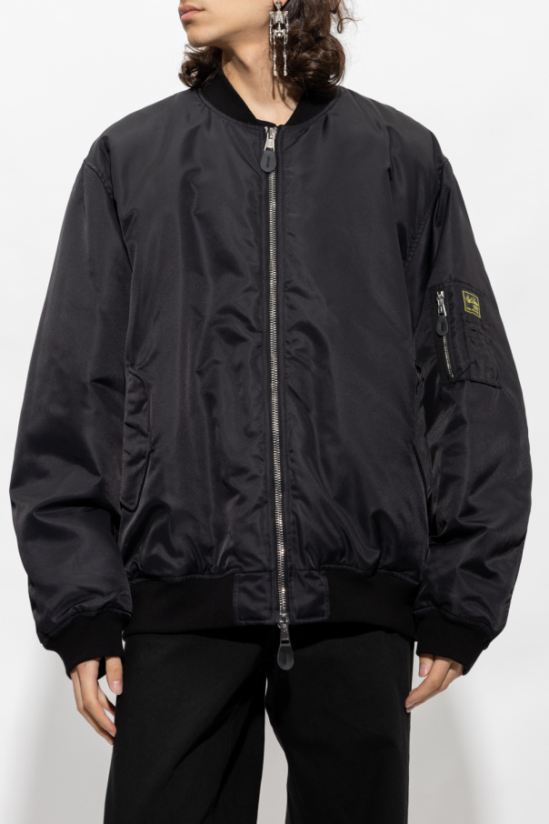 Black bomber jacket from Raf Simons. Crafted with a glossy finish, this style features a two-way zip fastening, a red graphic print at the back, multiple pockets accompanied by a logo patch on the shoulder, two snap-fastened flapped pockets on the front and elasticized trims on the collar, bottom hem and cuffs.
