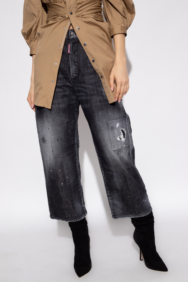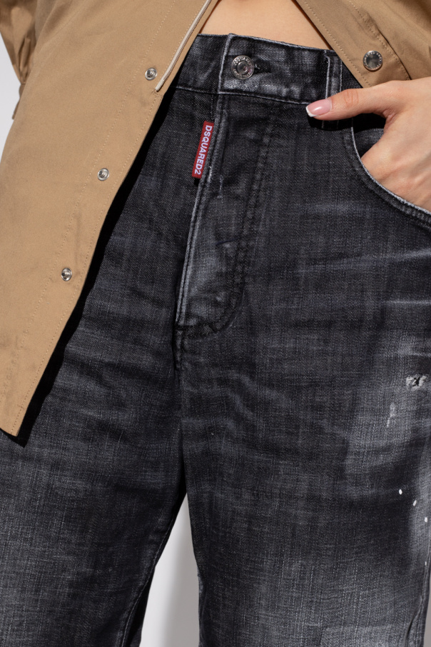 Black and grey ‘L.A. Jean’ distressed jeans from Dsquared2. Fastened with buttons, this pair falls down with slightly tapered legs and is complete with a white paint splatter effect, three front pockets and two back pockets.